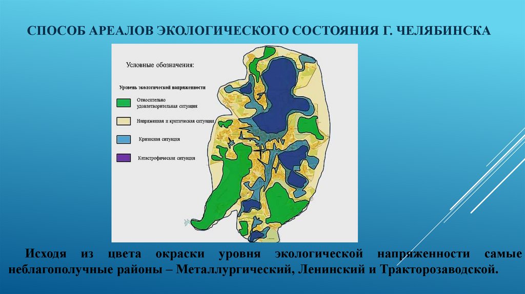 СПОСОБ АРЕАЛОВ ЭКОЛОГИЧЕСКОГО СОСТОЯНИЯ Г. ЧЕЛЯБИНСКАИсходя из цвета окраски уровня экологической напряженности самые