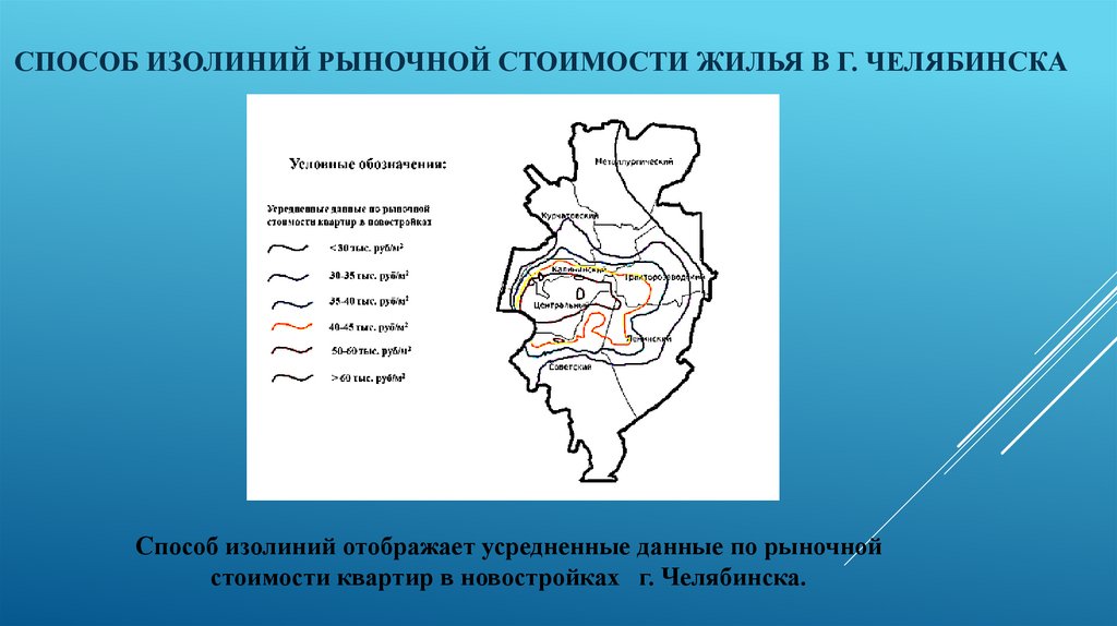 СПОСОБ ИЗОЛИНИЙ РЫНОЧНОЙ СТОИМОСТИ ЖИЛЬЯ В Г. ЧЕЛЯБИНСКАСпособ изолиний отображает усредненные данные по рыночной