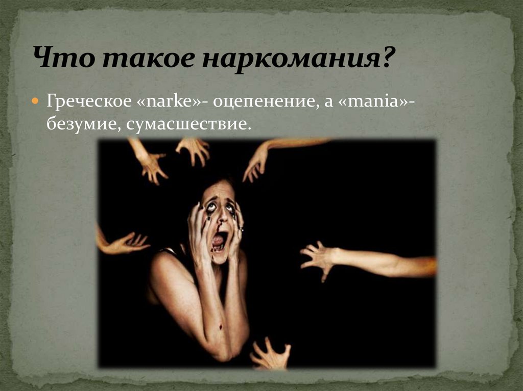 Греческое «narke»- оцепенение, а «mania»-безумие, сумасшествие.