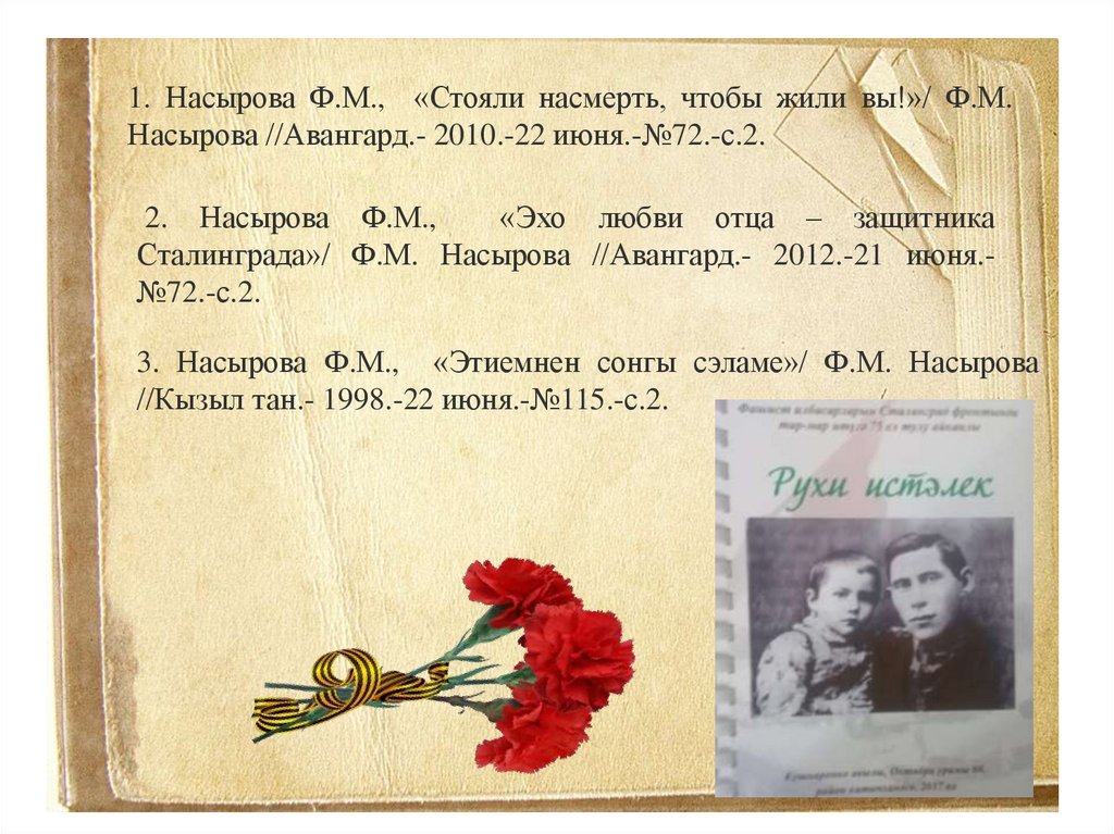 1. Насырова Ф.М., «Стояли насмерть, чтобы жили вы!»/ Ф.М.Насырова //Авангард.- 2010.-22 июня.-№72.-с.2.