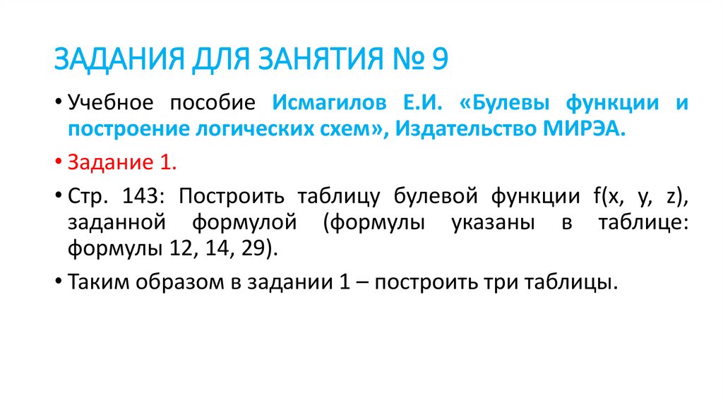 ЗАДАНИЯ ДЛЯ ЗАНЯТИЯ № 9• Учебное пособие Исмагилов Е.И. «Булевы функции и