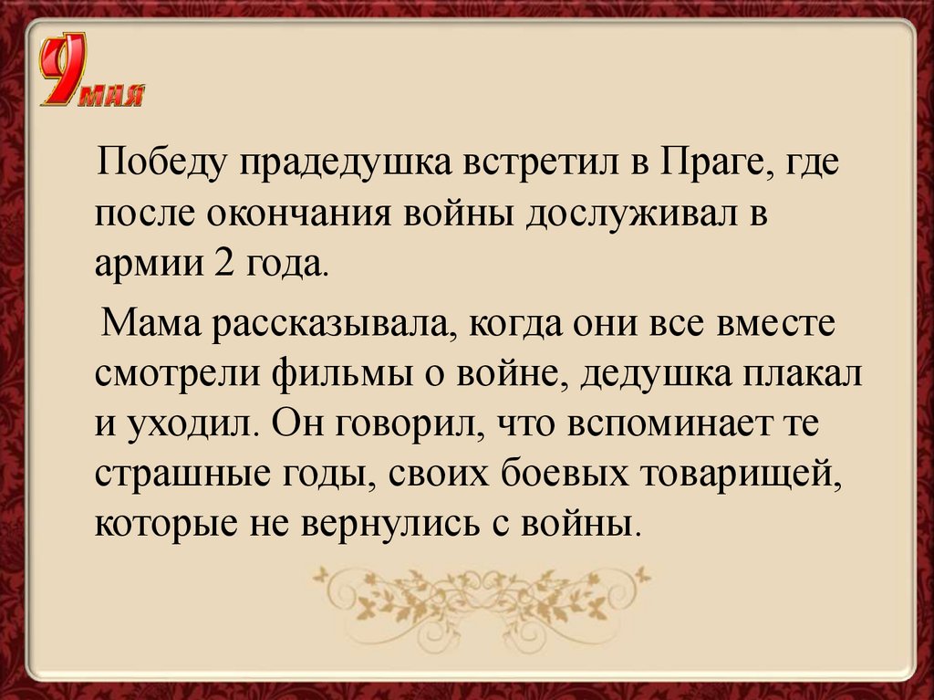 Победу прадедушка встретил в Праге, гдепосле окончания войны дослуживал в