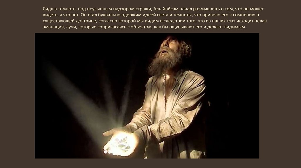 Сидя в темноте, под неусыпным надзором стражи, Аль-Хайсам начал размышлять о том, что он можетвидеть, а что нет. Он стал буквально одержим идеей света и темноты, что привело его к сомнению в