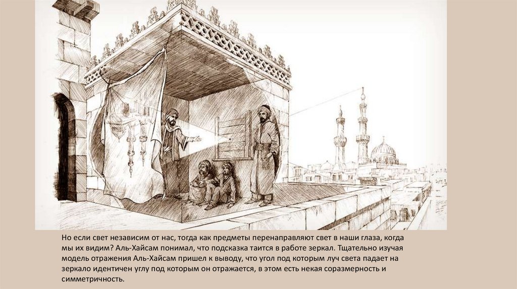 Но если свет независим от нас, тогда как предметы перенаправляют свет в наши глаза, когдамы их видим? Аль-Хайсам понимал, что подсказка таится в работе зеркал. Тщательно изучая