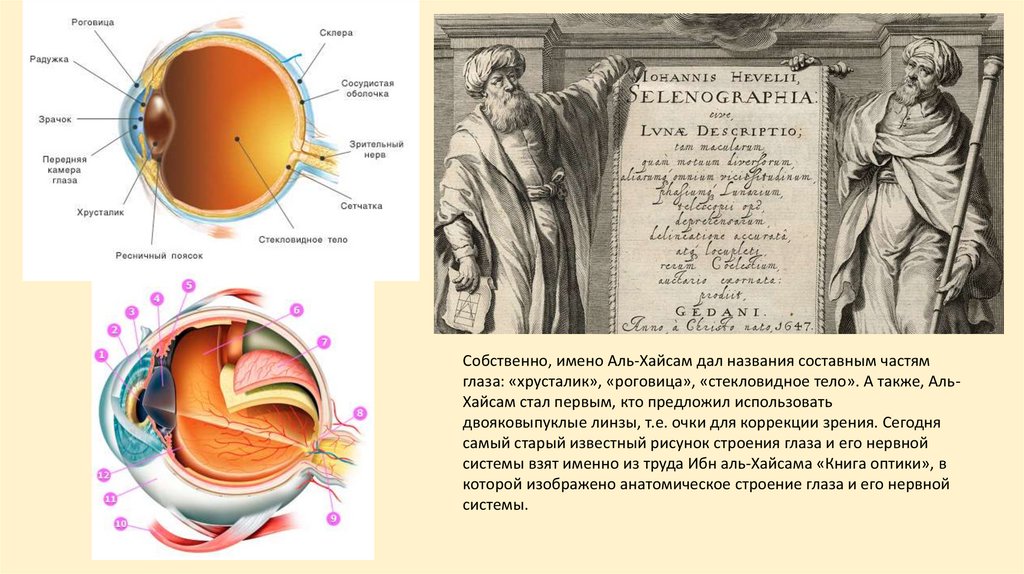 Собственно, имено Аль-Хайсам дал названия составным частямглаза: «хрусталик», «роговица», «стекловидное тело». А также, АльХайсам стал первым, кто предложил использовать