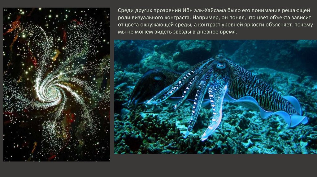 Среди других прозрений Ибн аль-Хайсама было его понимание решающейроли визуального контраста. Например, он понял, что цвет объекта зависит