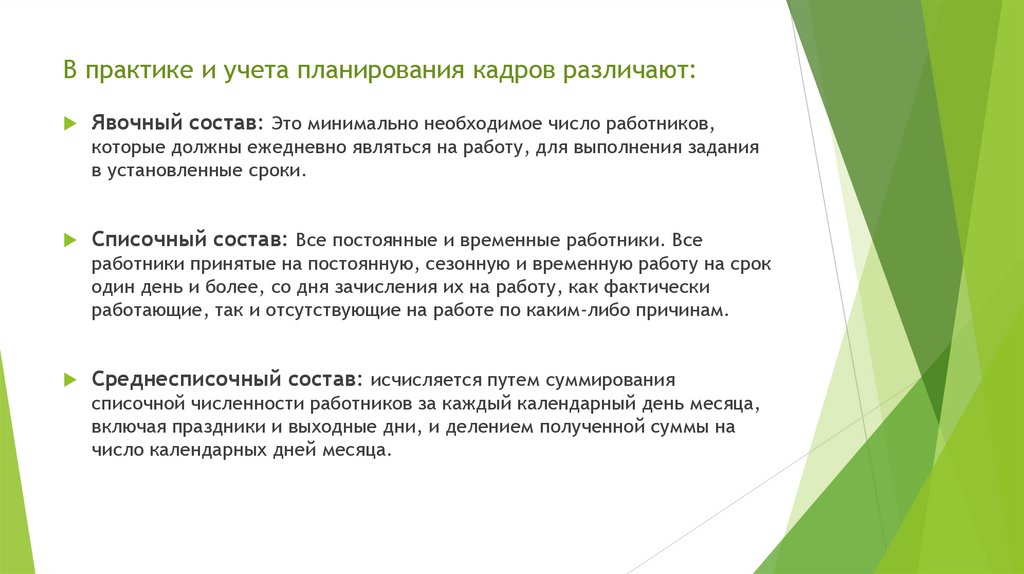 В практике и учета планирования кадров различают:Явочный состав: Это минимально необходимое число работников,