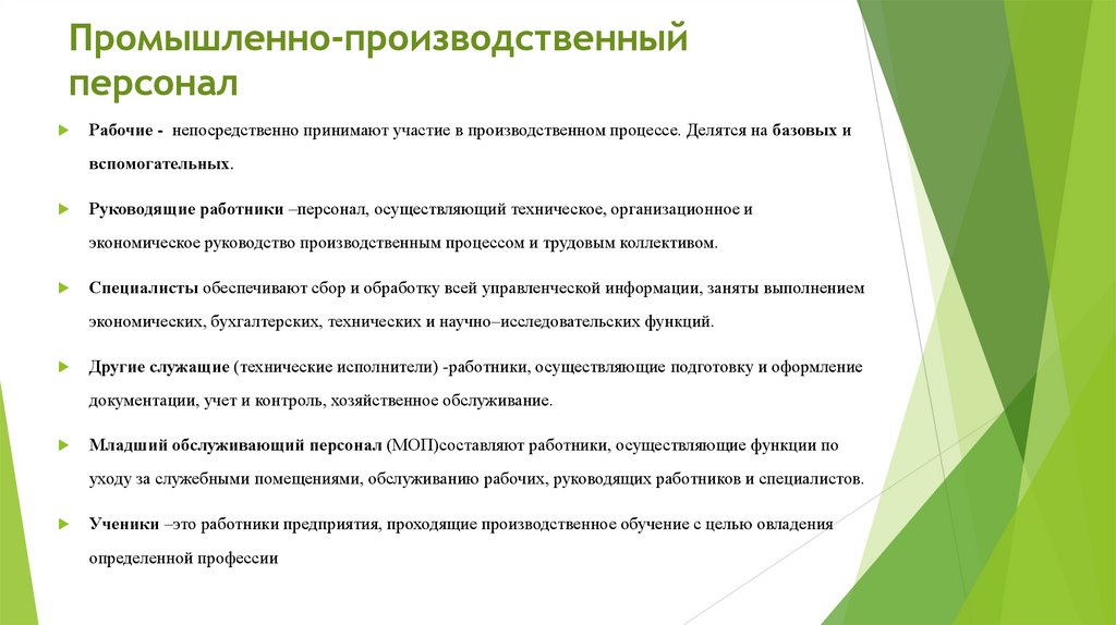 Рабочие - непосредственно принимают участие в производственном процессе. Делятся на базовых и