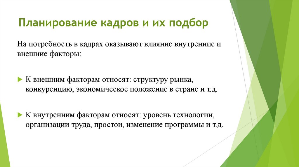 Планирование кадров и их подборНа потребность в кадрах оказывают влияние внутренние и