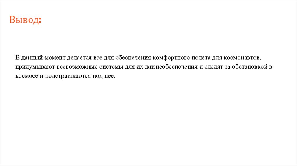 Вывод:В данный момент делается все для обеспечения комфортного полета для космонавтов,