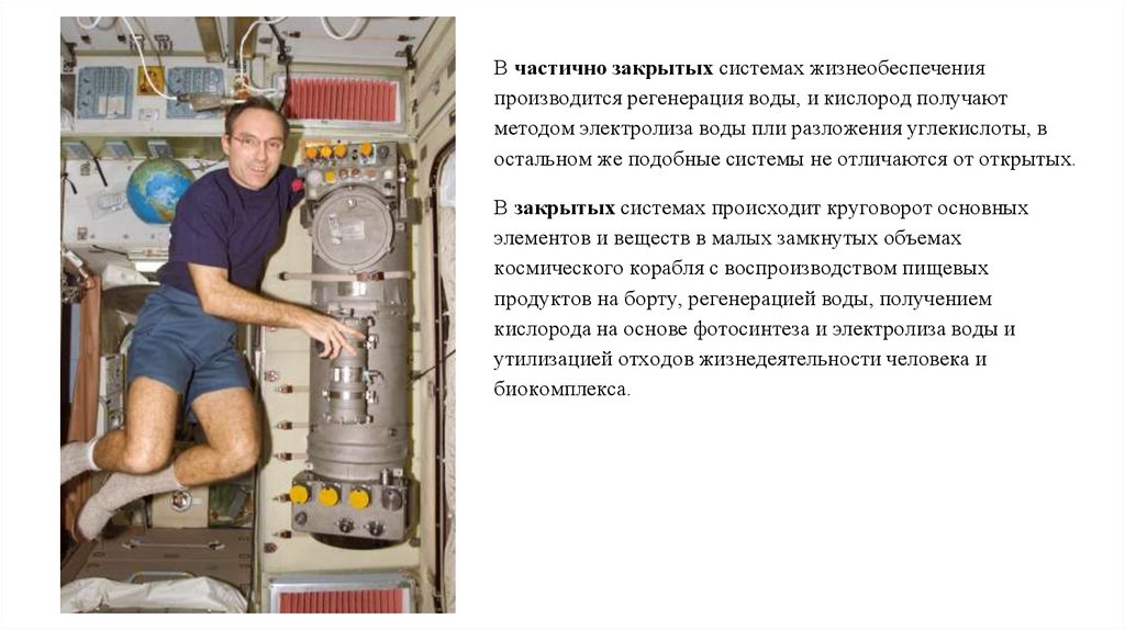 В частично закрытых системах жизнеобеспеченияпроизводится регенерация воды, и кислород получают