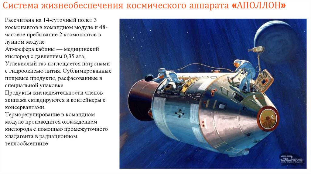 Система жизнеобеспечения космического аппарата «АПОЛЛОН»Рассчитана на 14-суточный полет 3