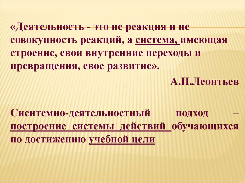 «Деятельность - это не реакция и несовокупность реакций, а система, имеющая