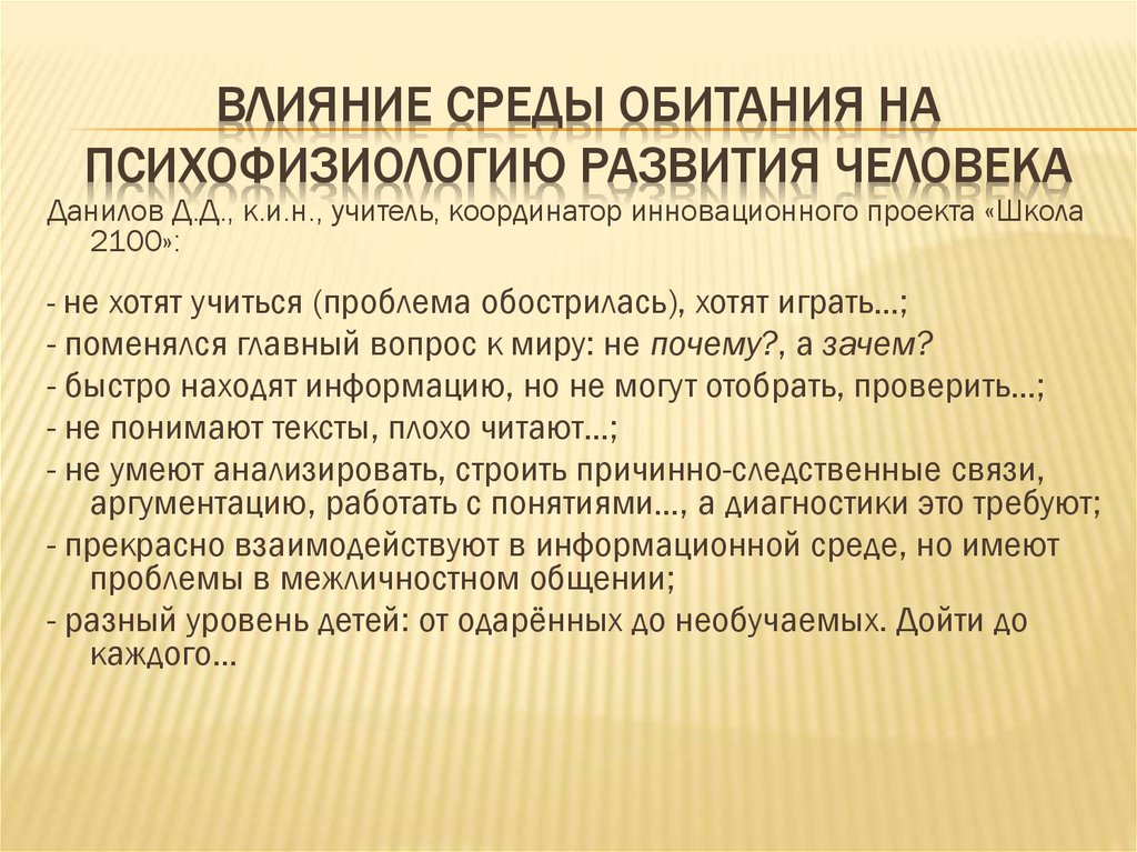 ВЛИЯНИЕ СРЕДЫ ОБИТАНИЯ НАПСИХОФИЗИОЛОГИЮ РАЗВИТИЯ ЧЕЛОВЕКА