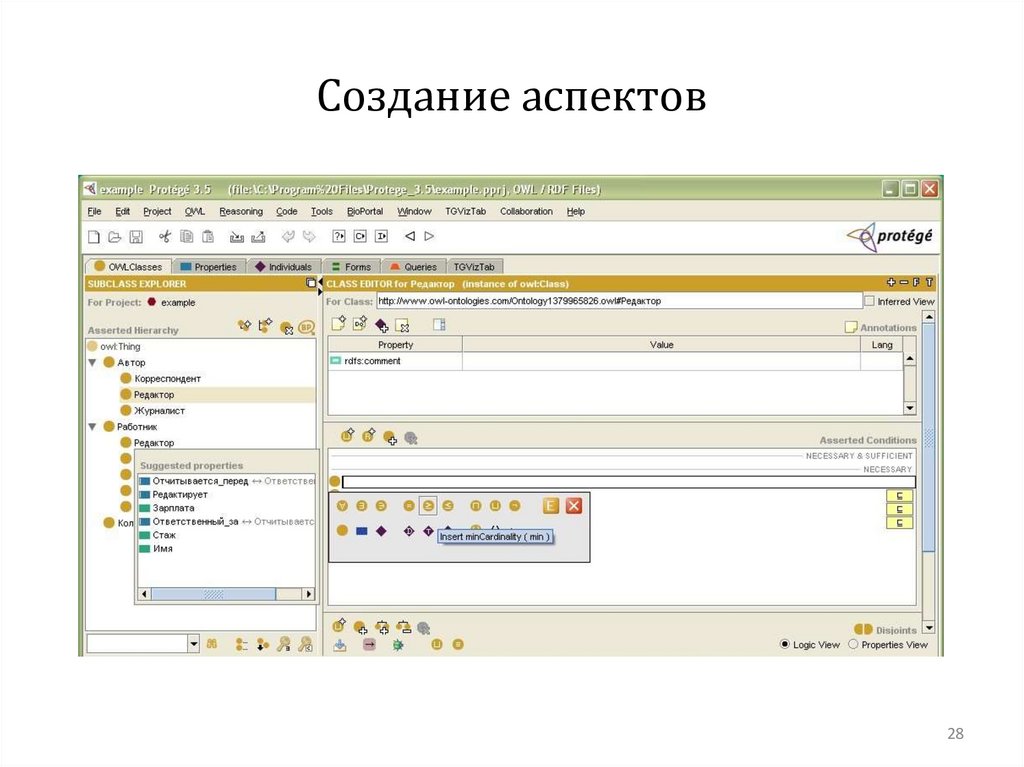 Создание аспектовCreate new expression->Редактирует->Insert minCardinality->1