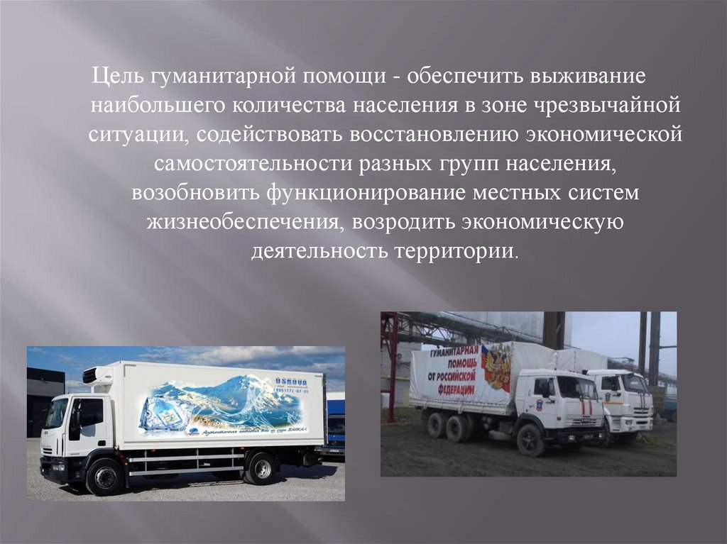 Цель гуманитарной помощи - обеспечить выживаниенаибольшего количества населения в зоне чрезвычайной