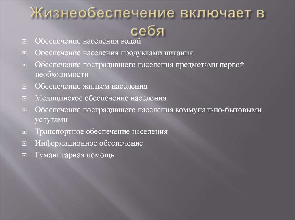 К видам жизнеобеспечения относятся обеспечение населенияводой, продуктами питания, предметами первой