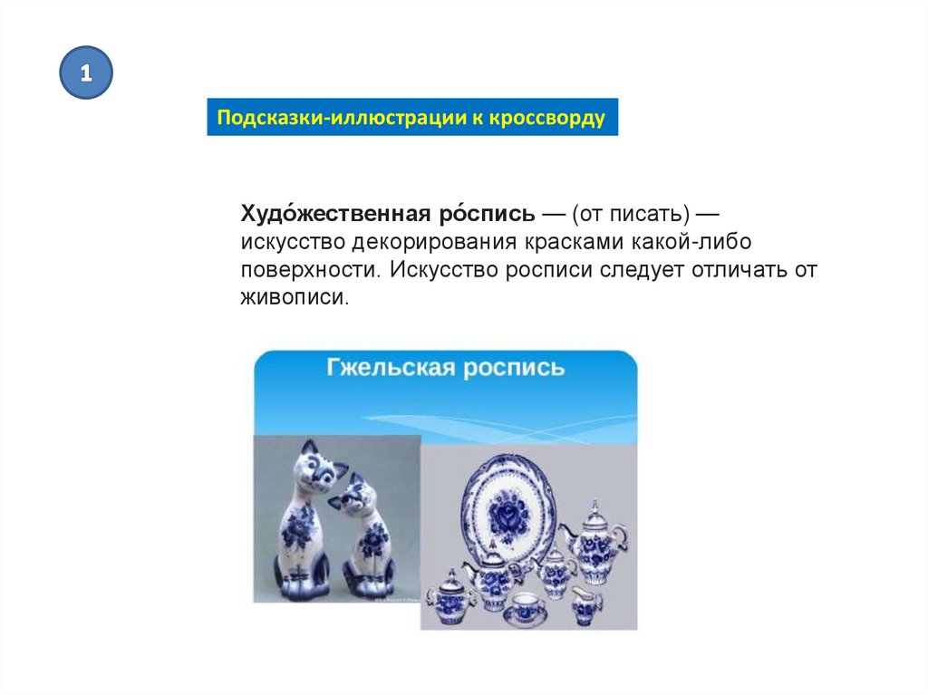 Подсказки-иллюстрации к кроссвордуХудо́жественная ро́спись — (от писать) —