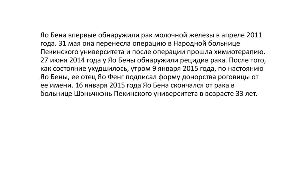 Яо Бена впервые обнаружили рак молочной железы в апреле 2011года. 31 мая она перенесла операцию в Народной больнице