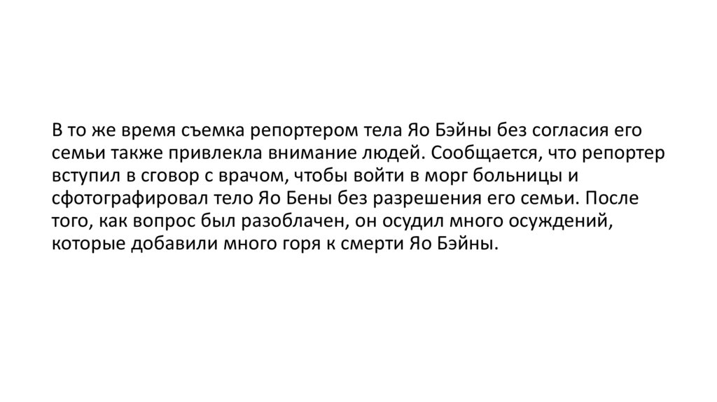 В то же время съемка репортером тела Яо Бэйны без согласия егосемьи также привлекла внимание людей. Сообщается, что репортер