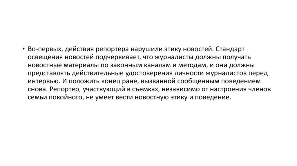 • Во-первых, действия репортера нарушили этику новостей. Стандартосвещения новостей подчеркивает, что журналисты должны получать