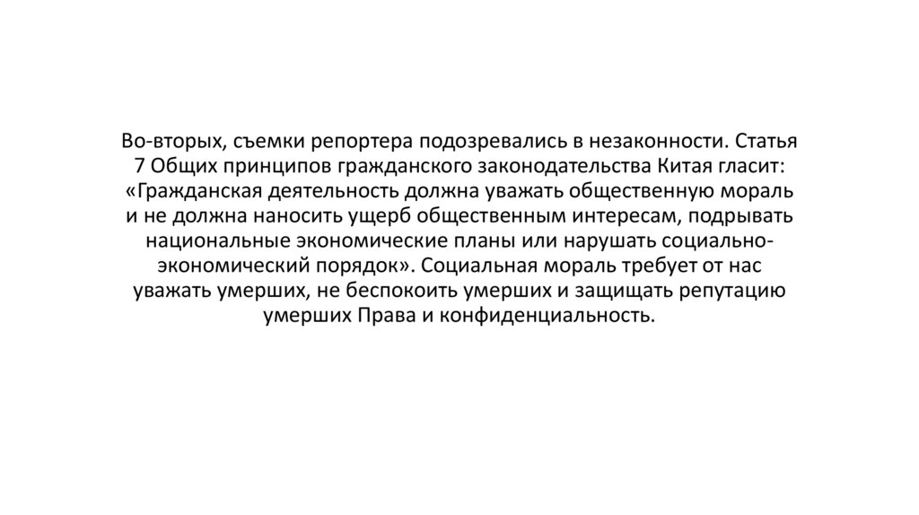 Во-вторых, съемки репортера подозревались в незаконности. Статья7 Общих принципов гражданского законодательства Китая гласит: