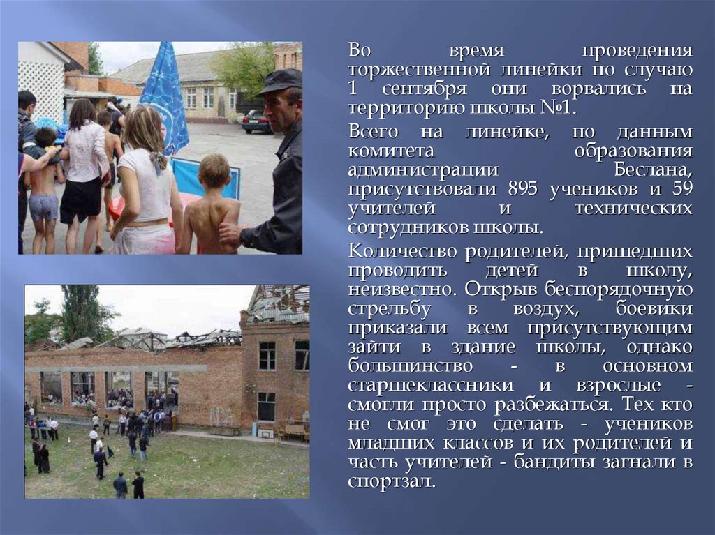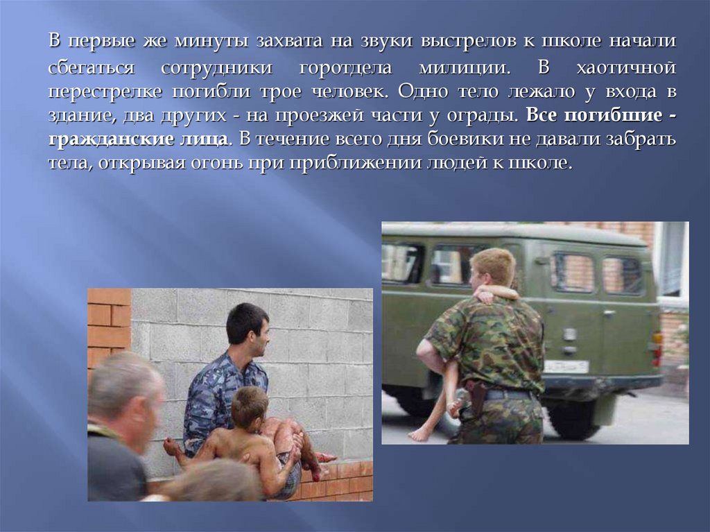 В первые же минуты захвата на звуки выстрелов к школе началисбегаться сотрудники горотдела милиции. В хаотичной