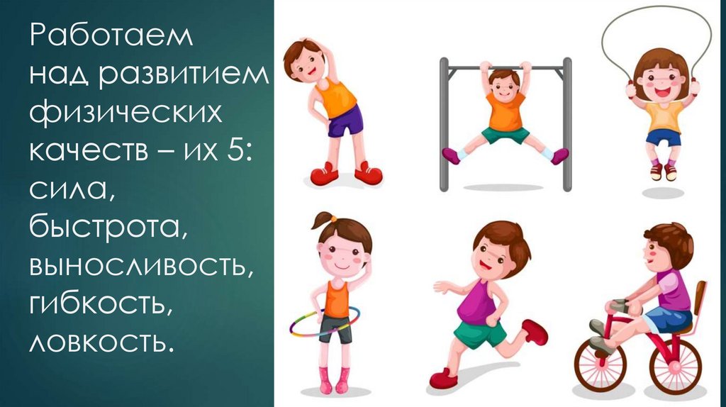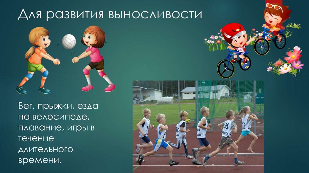 Для развития выносливостиБег, прыжки, езда