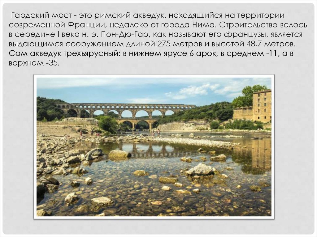 Гардский мост - это римский акведук, находящийся на территориисовременной Франции, недалеко от города Нима. Строительство велось
