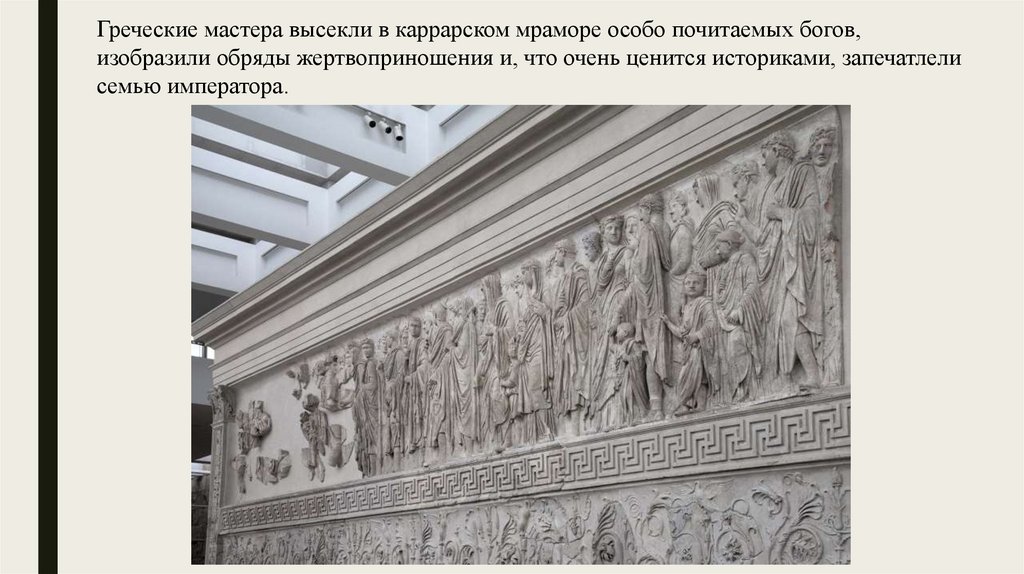 Греческие мастера высекли в каррарском мраморе особо почитаемых богов,изобразили обряды жертвоприношения и, что очень ценится историками, запечатлели