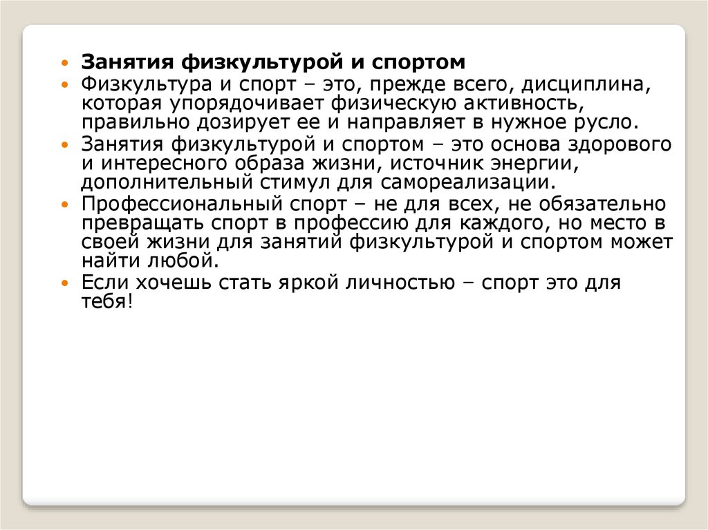 Занятия физкультурой и спортомФизкультура и спорт – это, прежде всего, дисциплина,