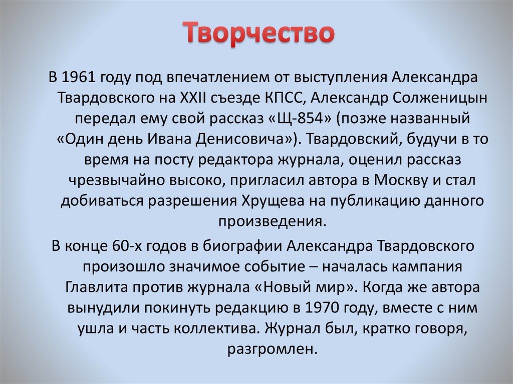 «Один день Ивана Денисовича»). Твардовский, будучи в то