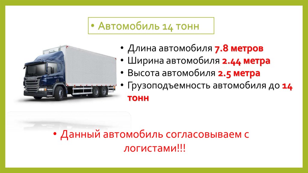 • Автомобиль 14 тоннДлина автомобиля 7.8 метров