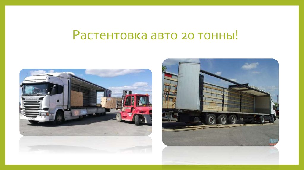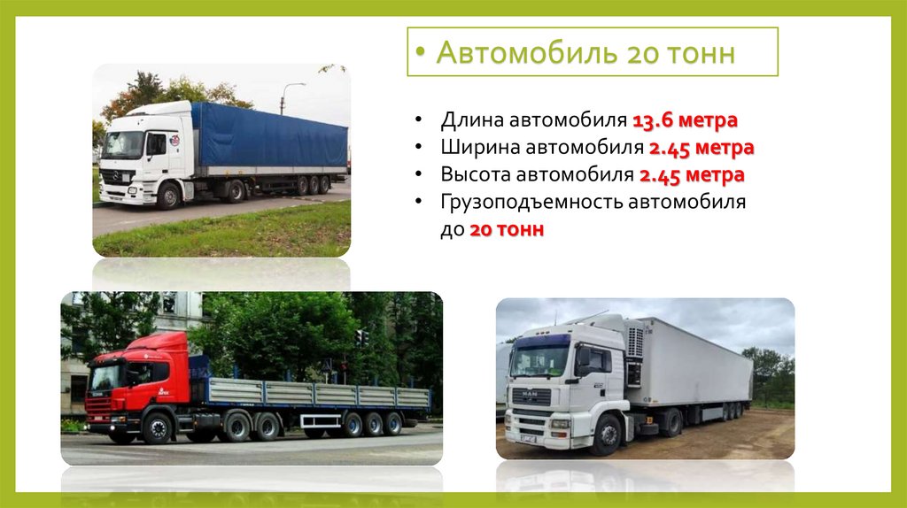 • Автомобиль 20 тоннДлина автомобиля 13.6 метра