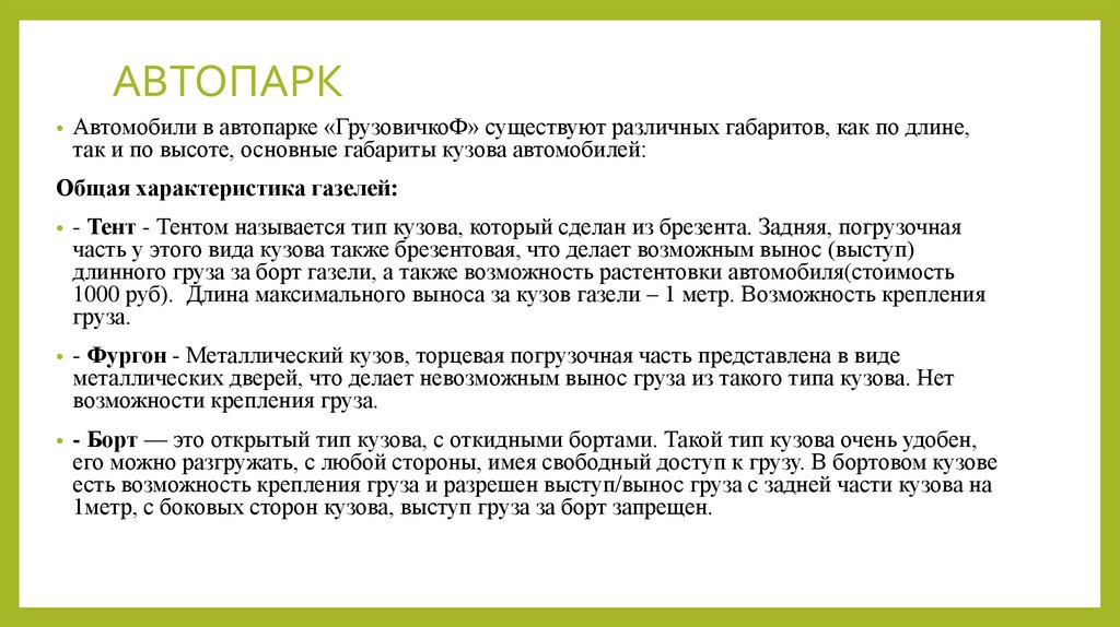 АВТОПАРКАвтомобили в автопарке «ГрузовичкоФ» существуют различных габаритов, как по длине,