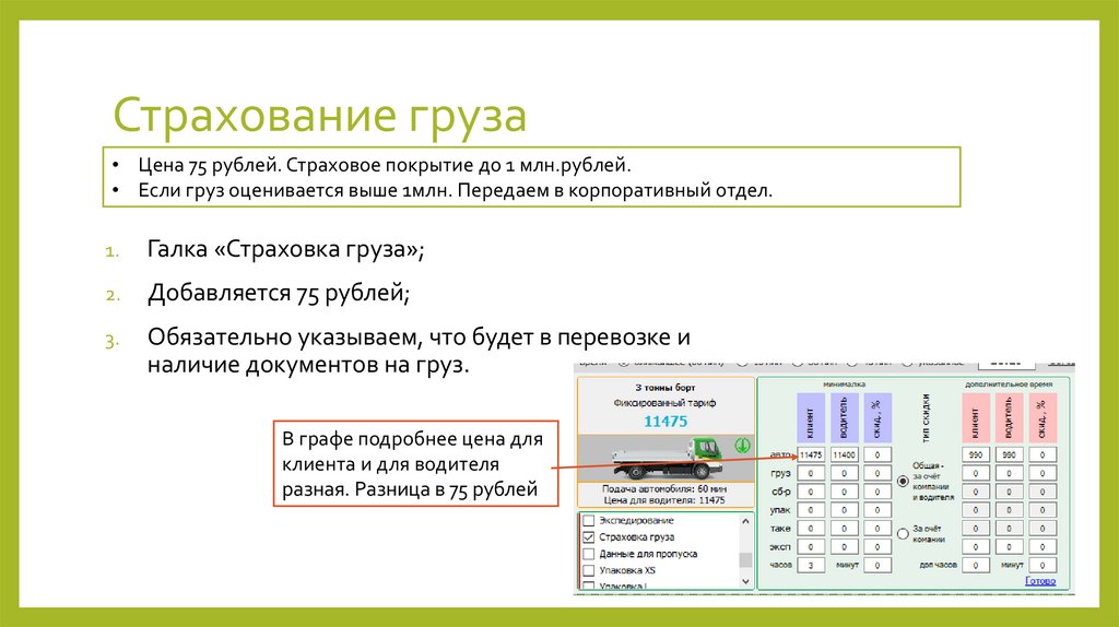 Страхование груза• Цена 75 рублей. Страховое покрытие до 1 млн.рублей.