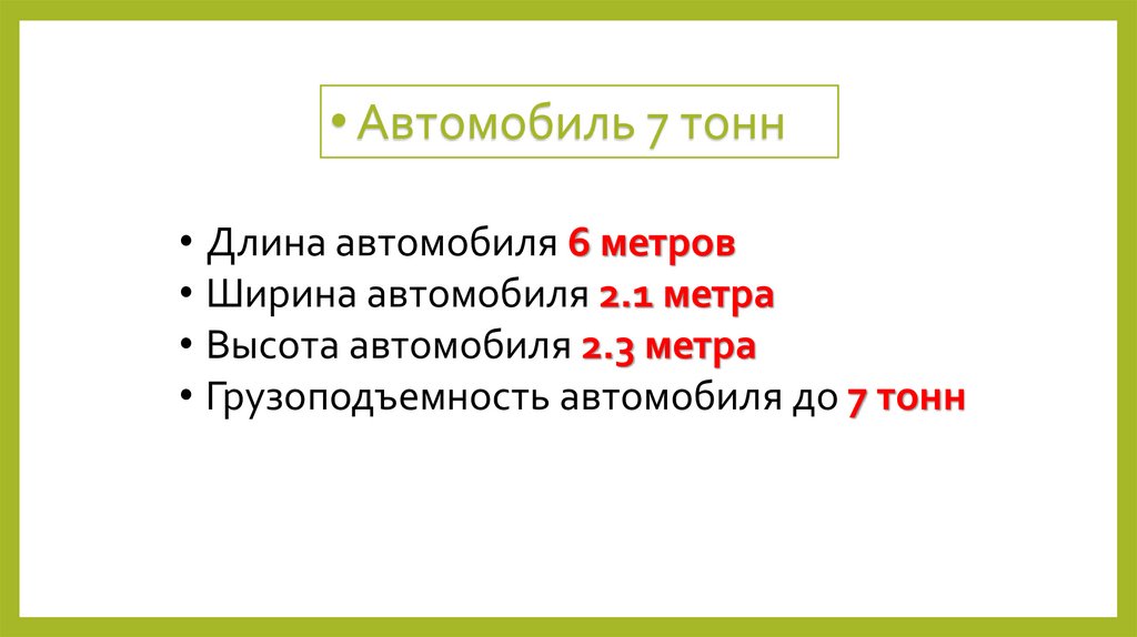 • Автомобиль 7 тонн• Длина автомобиля 6 метров