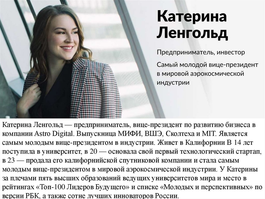Катерина Ленгольд — предприниматель, вице-президент по развитию бизнеса вкомпании Astro Digital. Выпускница МИФИ, ВШЭ, Сколтеха и MIT. Является