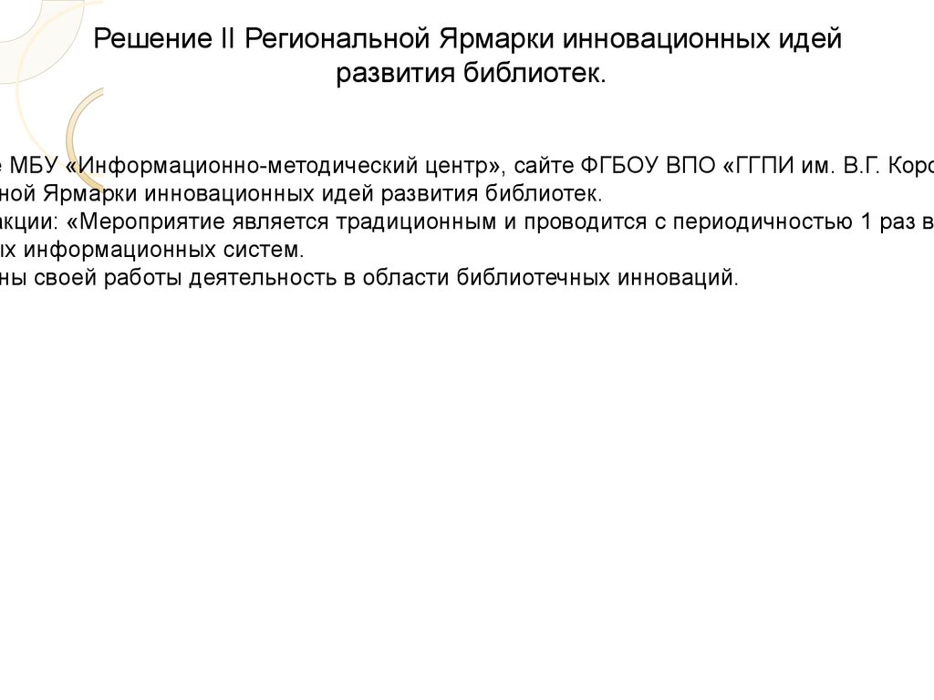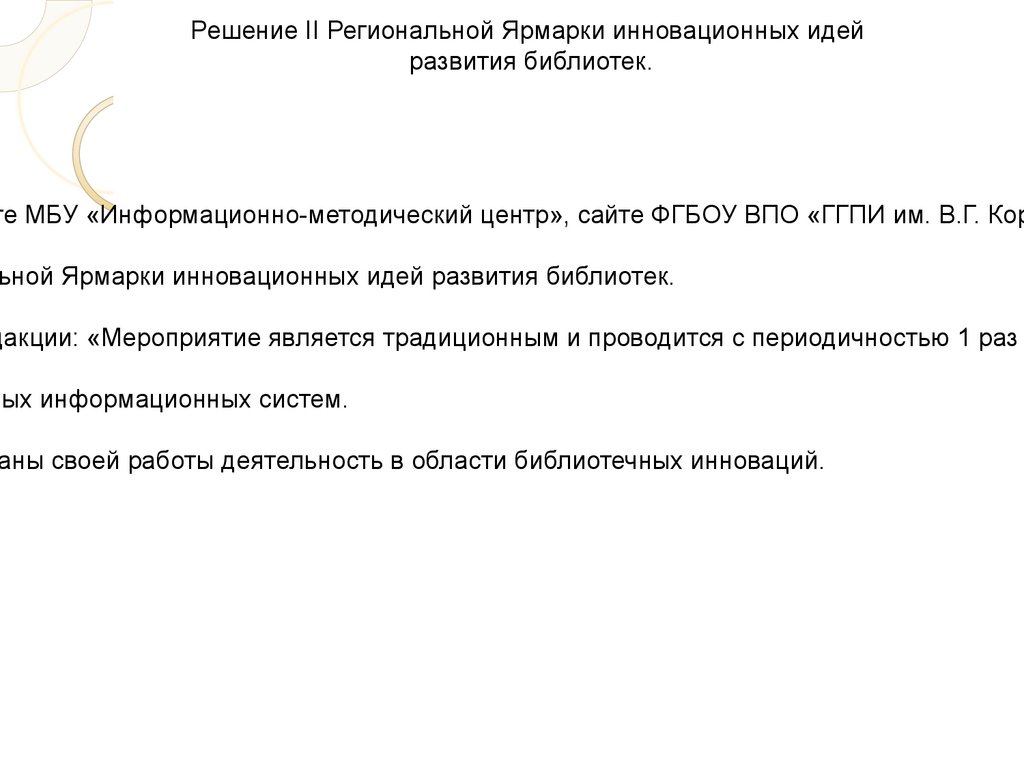 Решение II Региональной Ярмарки инновационных идейразвития библиотек.