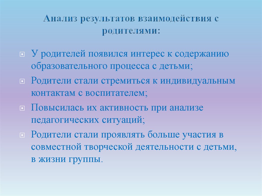 У родителей появился интерес к содержаниюобразовательного процесса с детьми;
