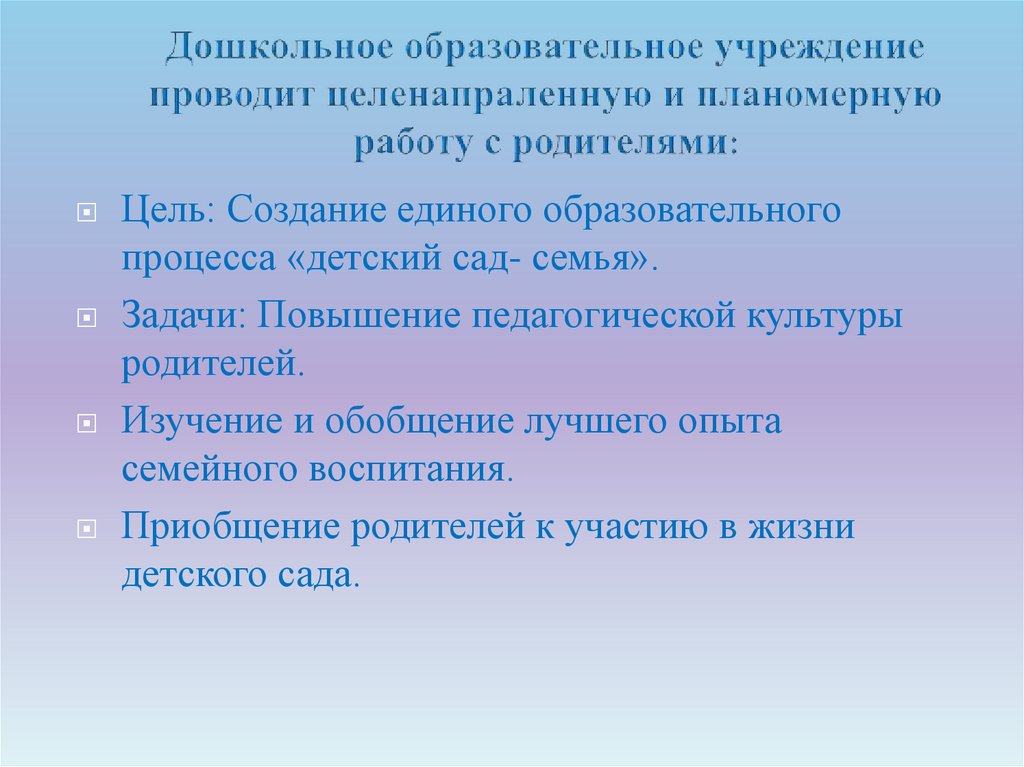 Цель: Создание единого образовательногопроцесса «детский сад- семья».