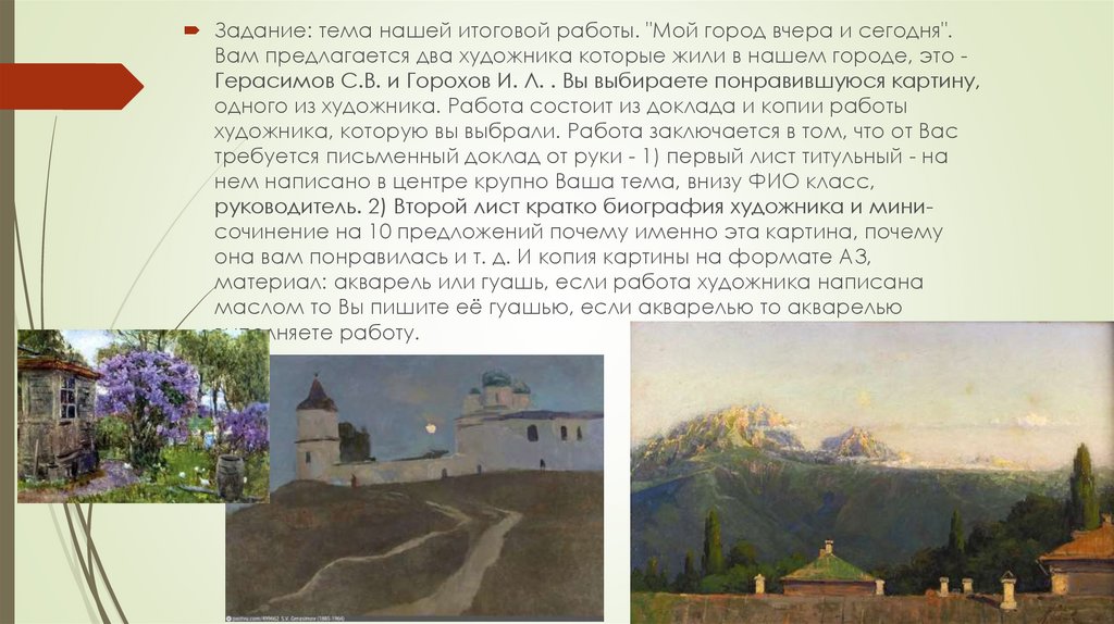 Задание: тема нашей итоговой работы. "Мой город вчера и сегодня".Вам предлагается два художника которые жили в нашем городе, это Герасимов С.В. и Горохов И. Л. . Вы выбираете понравившуюся картину,