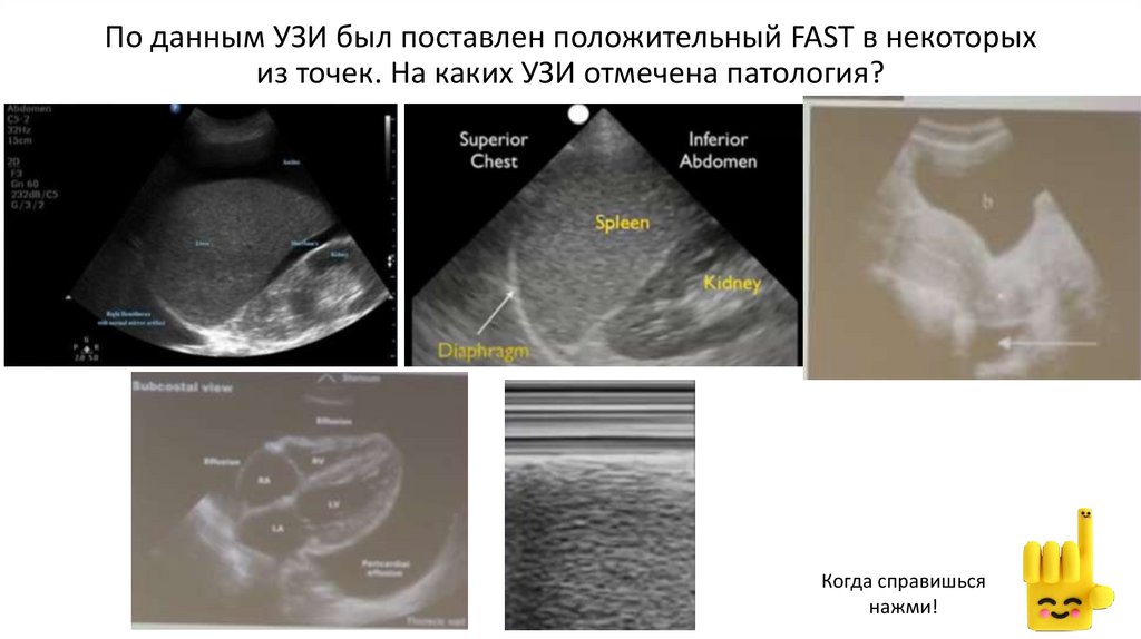 По данным УЗИ был поставлен положительный FAST в некоторыхиз точек. На каких УЗИ отмечена патология?
