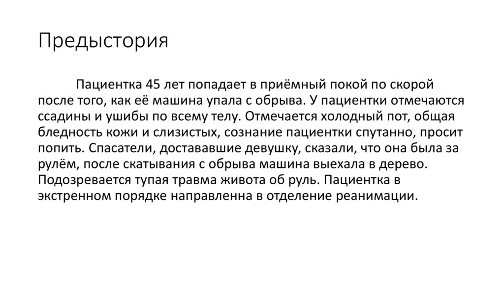 ПредысторияПациентка 45 лет попадает в приёмный покой по скорой