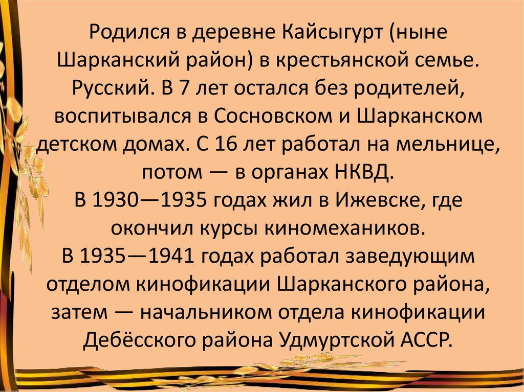 Родился в деревне Кайсыгурт (нынеШарканский район) в крестьянской семье.