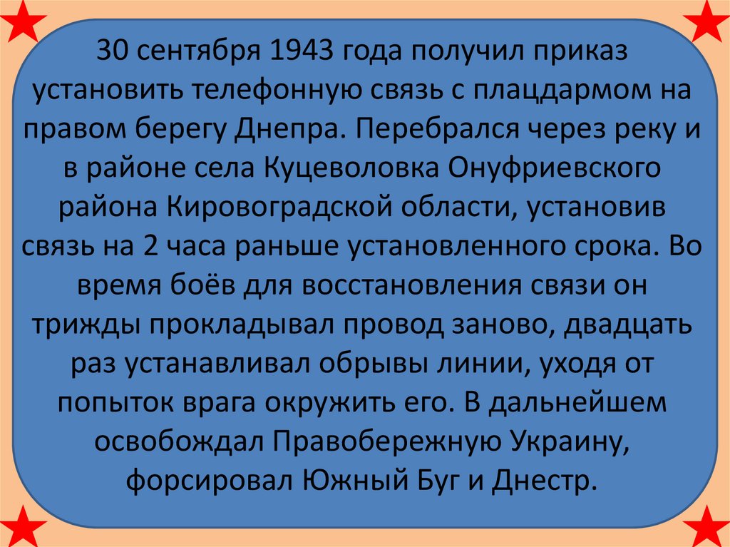 30 сентября 1943 года получил приказустановить телефонную связь с плацдармом на
