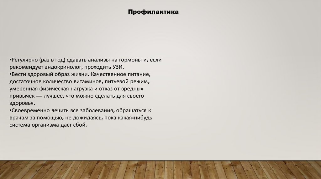 Профилактика•Регулярно (раз в год) сдавать анализы на гормоны и, если