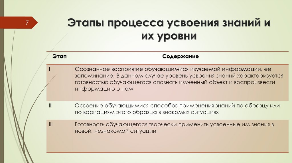Этапы процесса усвоения знаний иих уровни