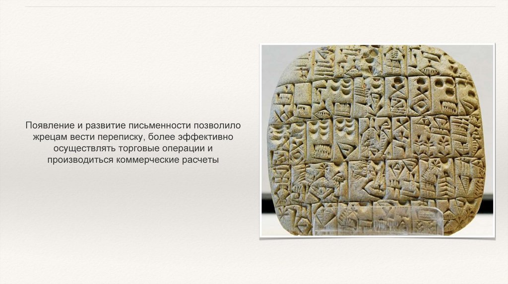 Побочным результатом управленческой деятельности жрецов стало появление письменности.