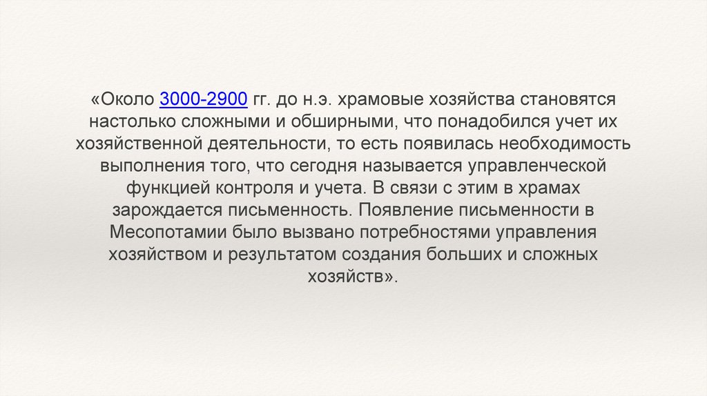 «Около 3000-2900 гг. до н.э. храмовые хозяйства становятсянастолько сложными и обширными, что понадобился учет их
